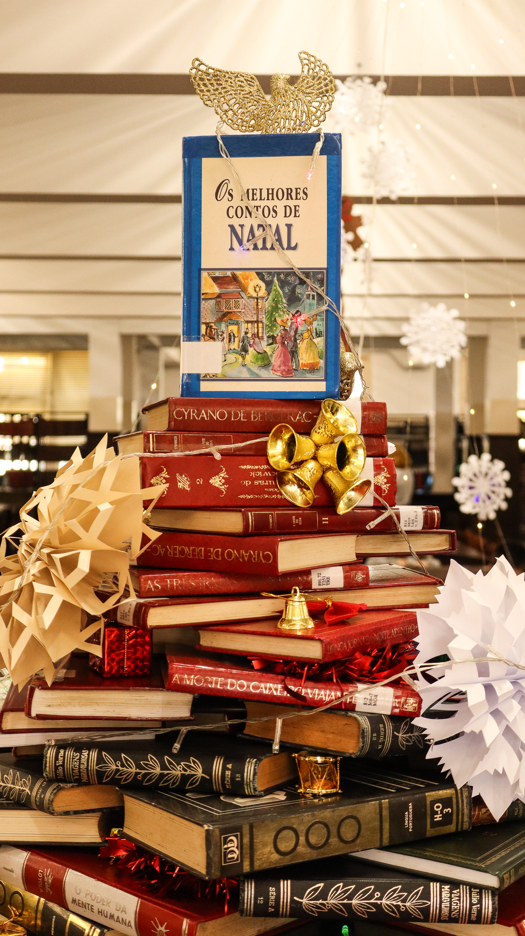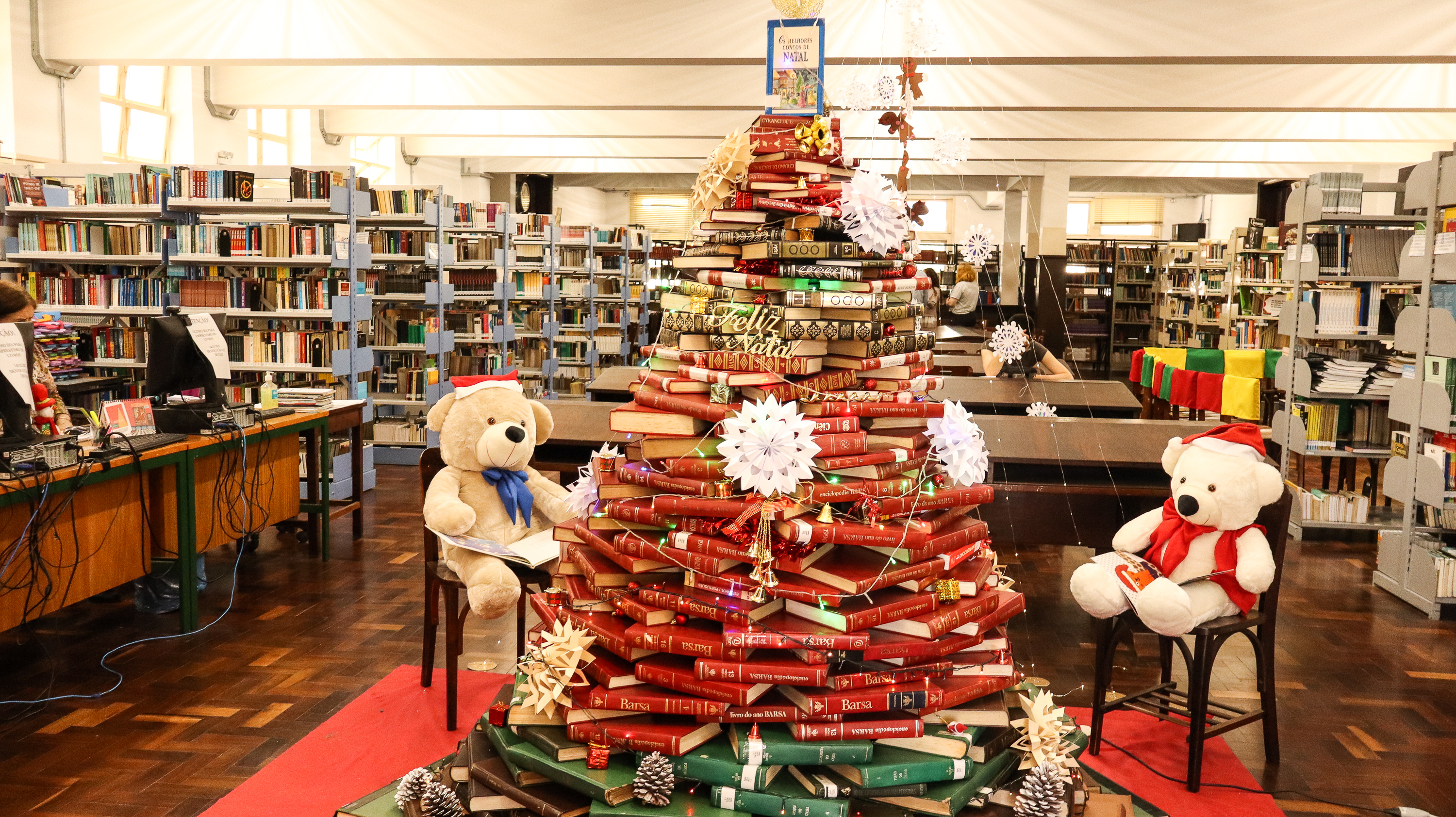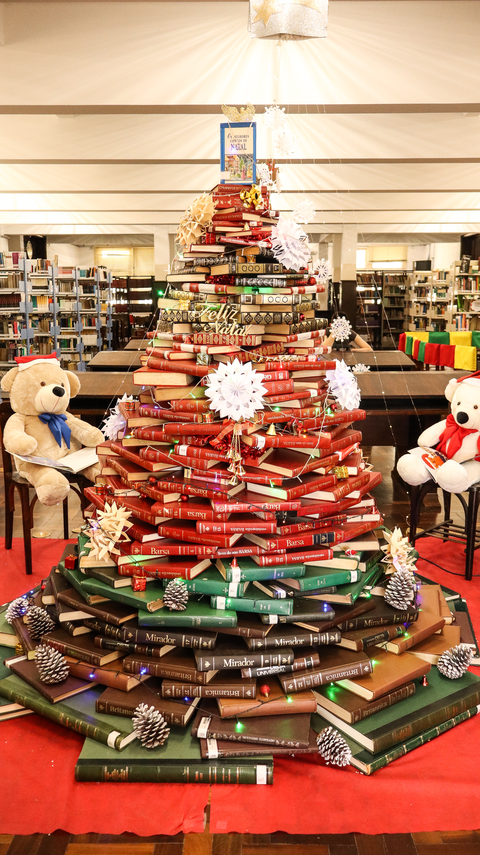 Árvore de livros da biblioteca e cantata no início da noite marcam alusões ao Natal 2025