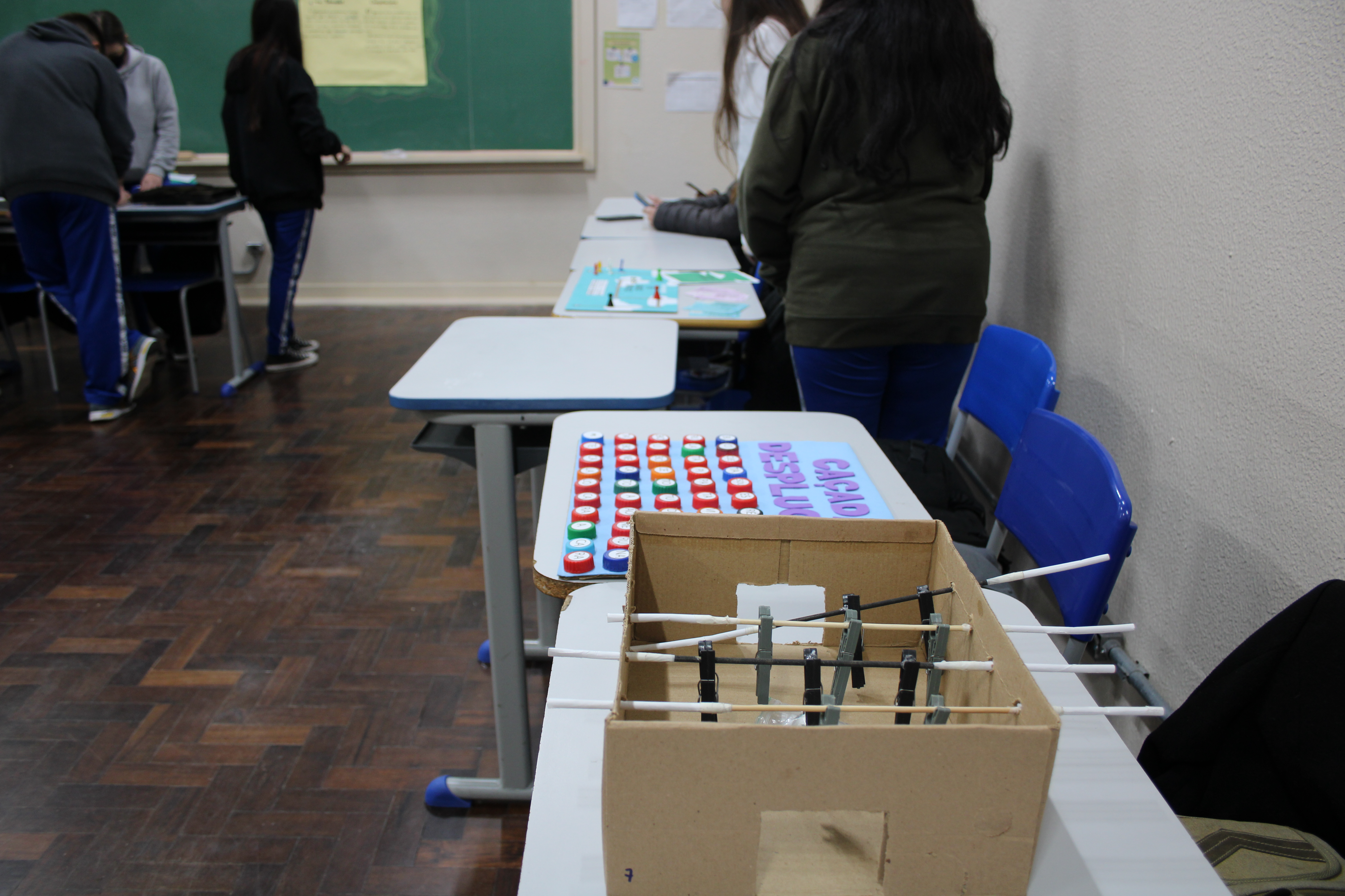 No lugar de celular, tampinhas de garrafa. Em vez de computador, pedaços de papelão. Estimular o raciocínio