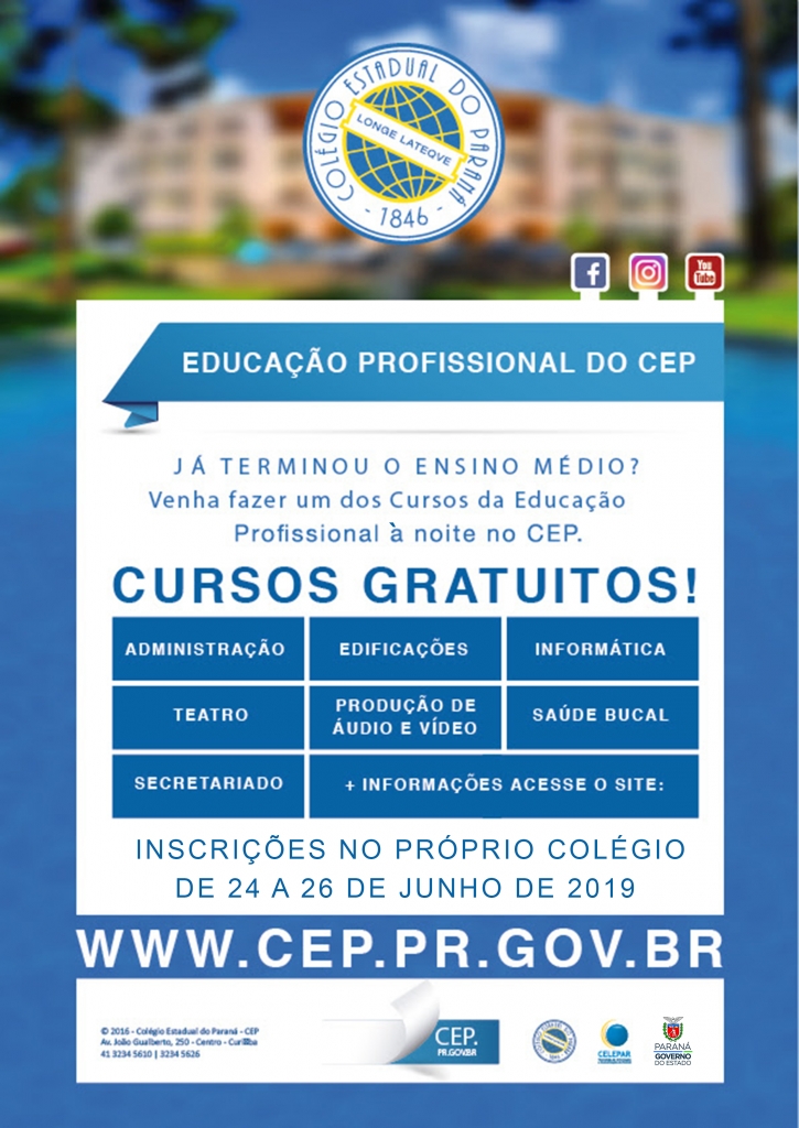 O Colégio Estadual do Paraná (CEP) acaba de lançar o Edital para o Processo de Seleção aos Cursos Técnicos da Educação Profissional, na modalidade subsequente (para quem já concluiu o Ensino Médio). Para os aprovados, as aulas começam neste segundo semestre de 2019.