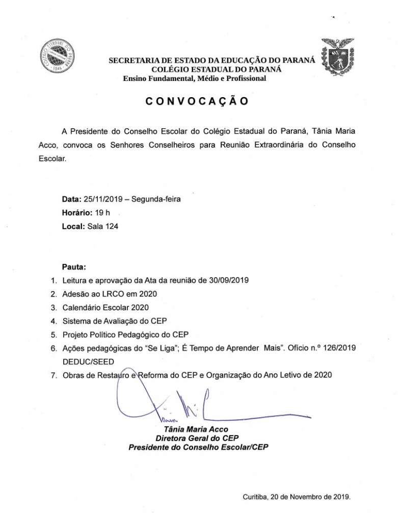 Notícias Convocação: Reunião Extraordinária Conselho Escolar - 25/11/2019. 20/11/2019 - 16:28 Compartilhe: Voltar Início Imprimir Baixar