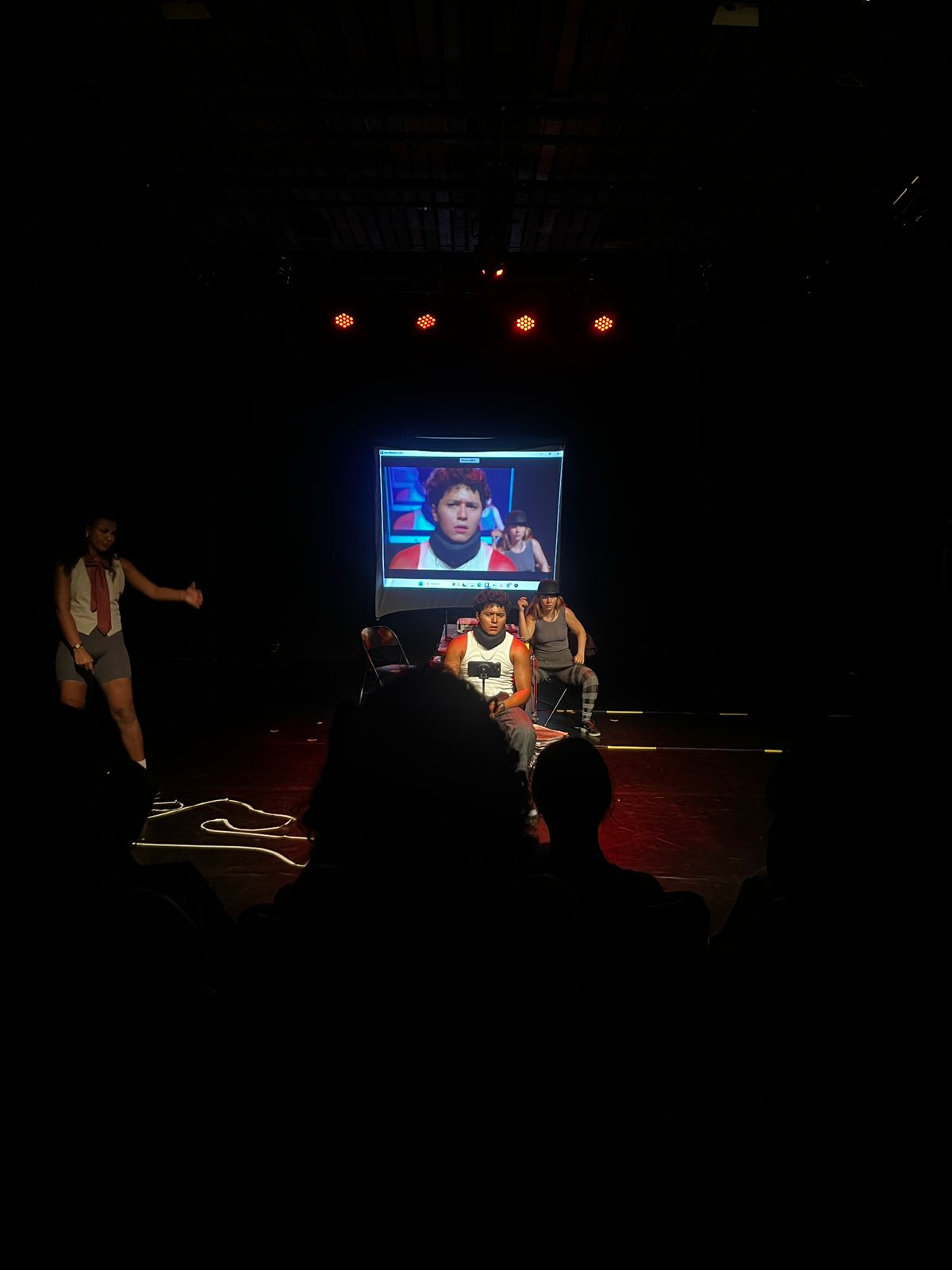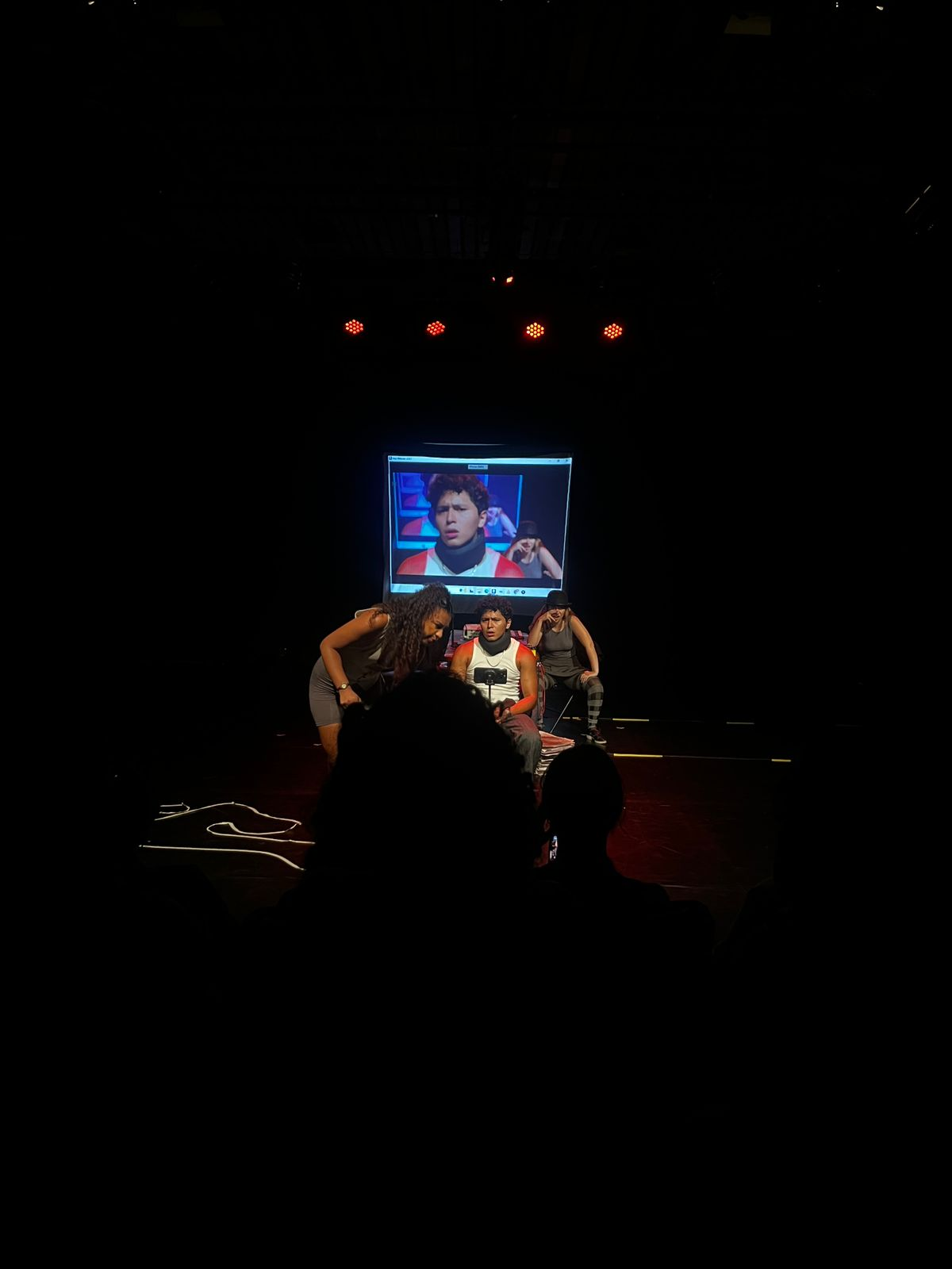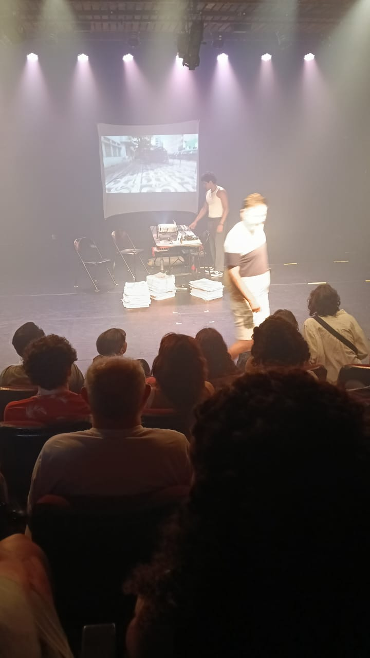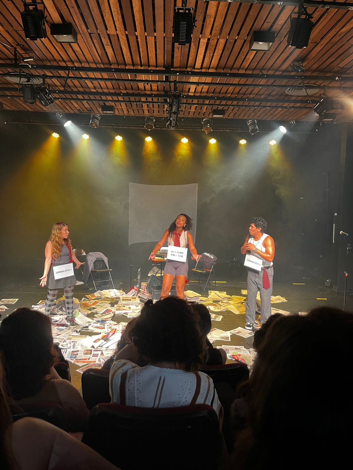 É um estudo cênico, um laboratório compartilhado, em que o palco assume o papel de mesa de apuração, sala de ensaio, sala de imprensa, delegacia, feed, tribunal e leito de morte.