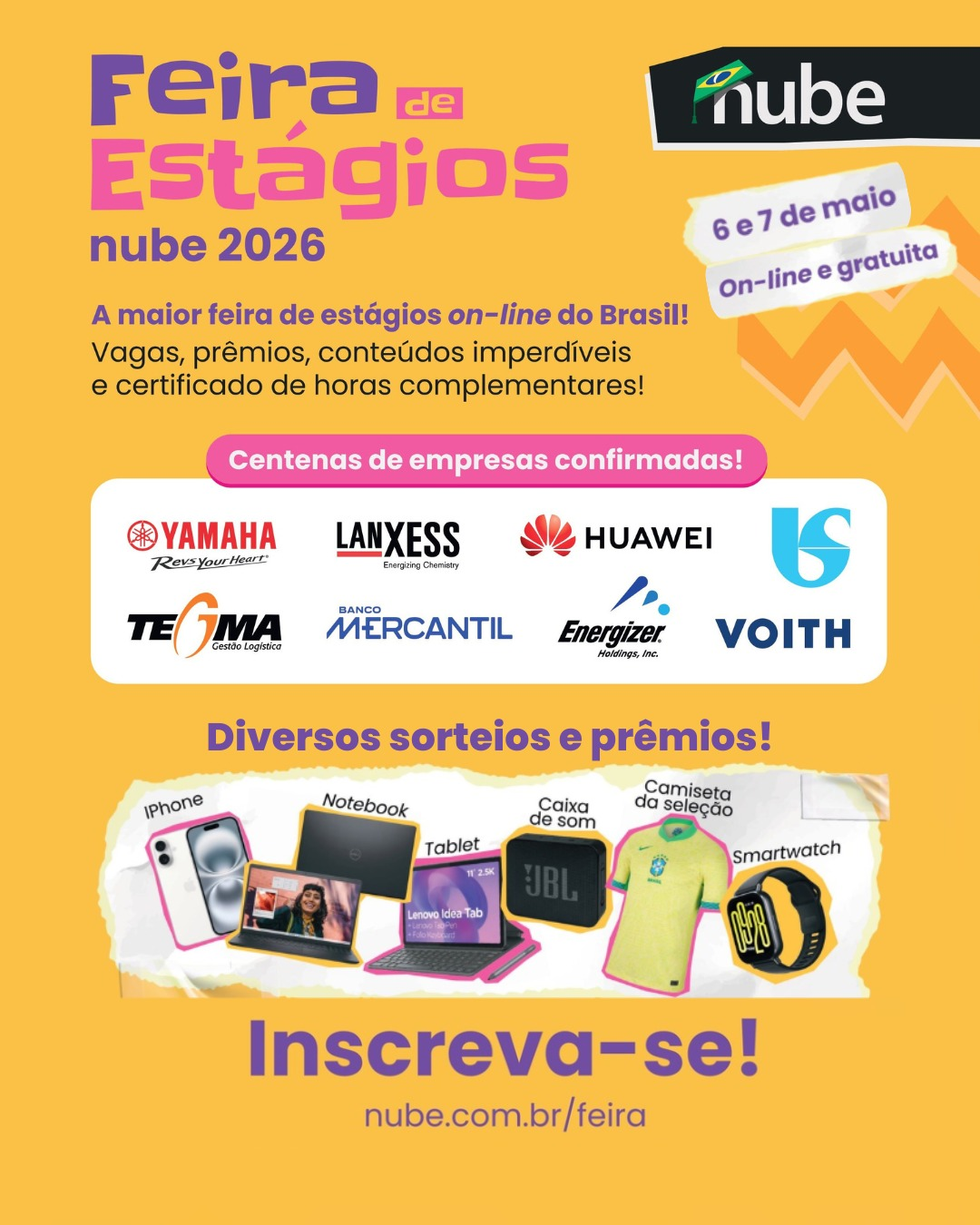 Ei, não perde essa! Já se inscreveu na Feira de Estágios Nube 2026? Vai rolar vagas, dicas de carreira, empresas contratando e muitos sorteios! É gratuito e online! Acesse www.nube.com.br/feira para se inscrever.