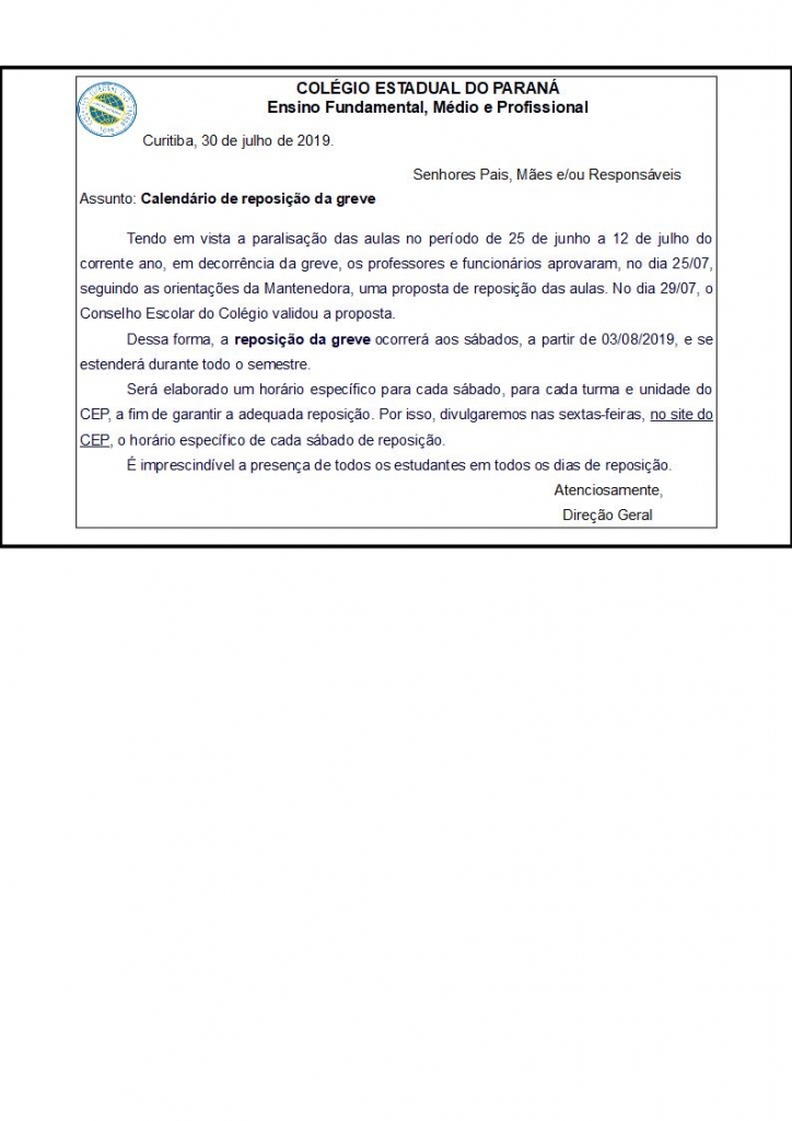 Notícias INFORME: Calendário de Reposição da Greve 30/07/2019 - 15:05 Compartilhe: Voltar Início Imprimir Baixar