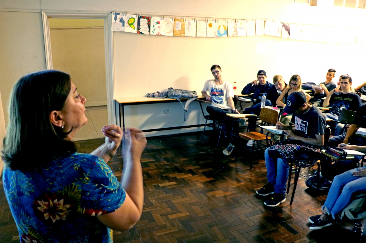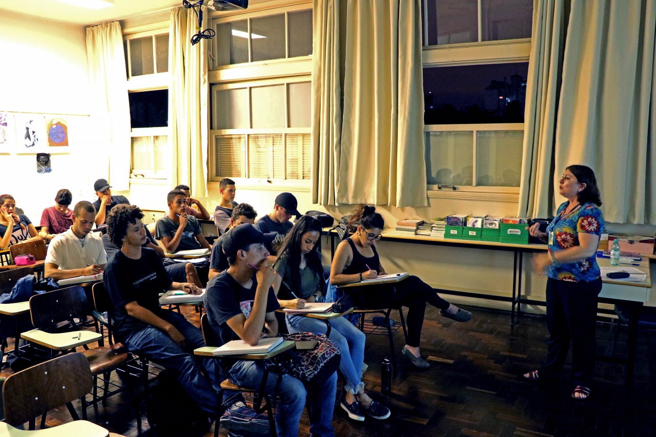 Nas imagens, a turma do 3A do Ensino Médio noturno assiste a uma aula sobre Redação no ENEM com a professora Andréa Zelaquett.